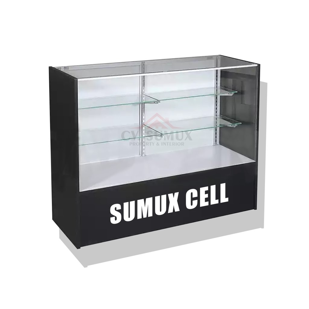 Etalase display kaca dengan tiga rak bertingkat dan branding “SUMUX CELL” di bagian bawah. Desain sederhana dan elegan, cocok untuk konter penjualan atau tempat display utama produk kecil bernilai tingg.