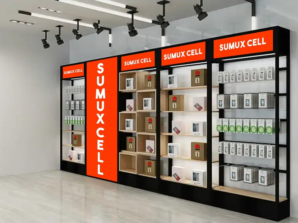 Rak dinding modern berwarna hitam dengan aksen oranye dan branding “SUMUX CELL”. Terdiri dari beberapa rak display yang menyatu, ideal untuk memajang berbagai produk retail seperti gadget, aksesoris, atau elektronik keci.