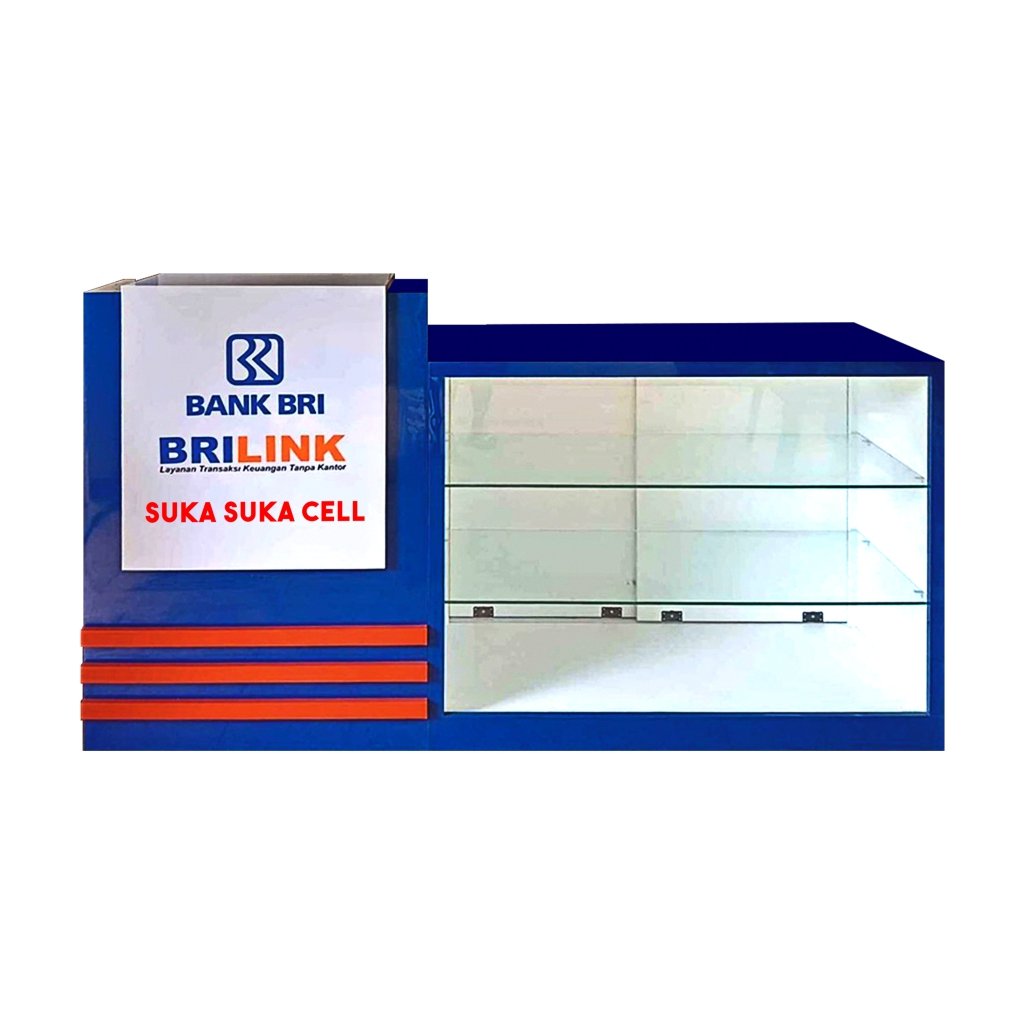 Meja etalase kombinasi konter layanan BRILink dan rak display kaca. Bagian kiri untuk branding dan pelayanan, bagian kanan dengan rak kaca transparan cocok untuk memajang produk seperti handphone atau aksesoris.