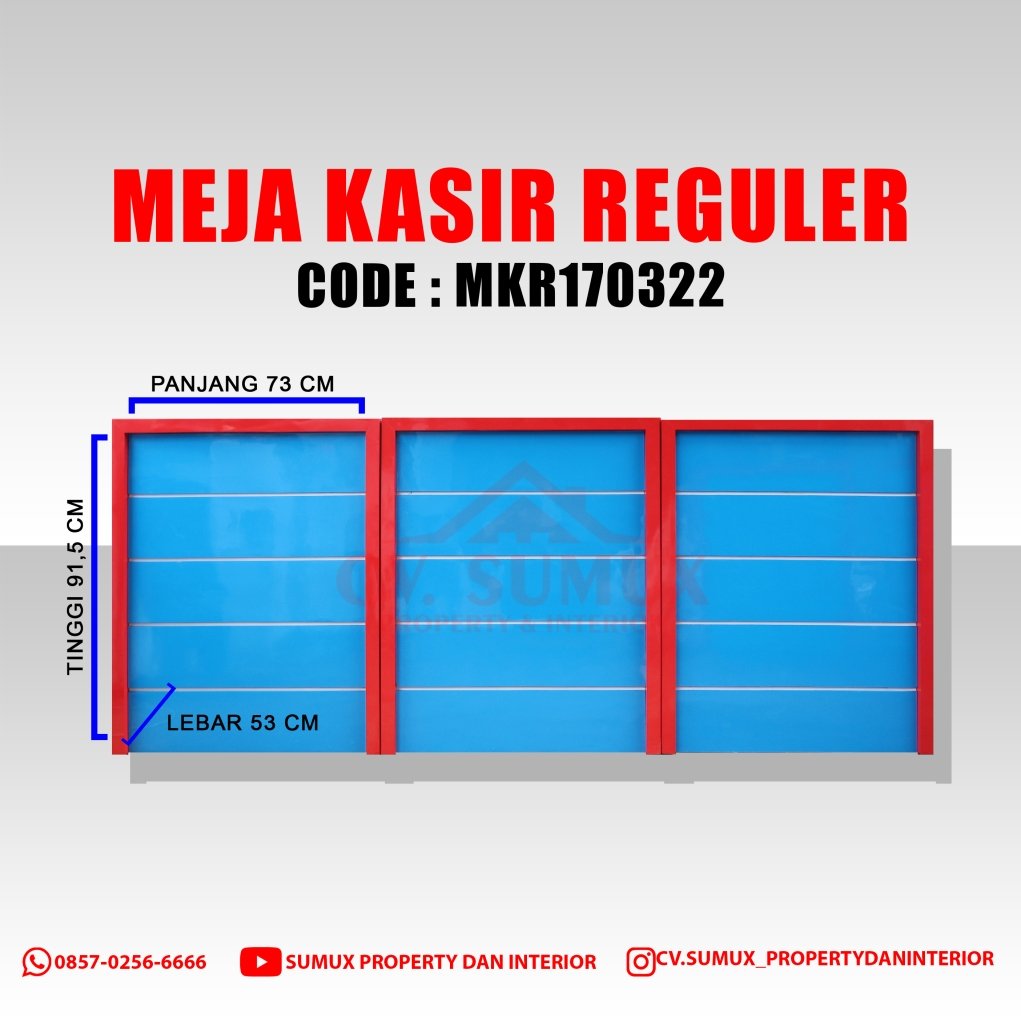 Meja kasir reguler dengan desain minimalis berwarna merah dan biru. Memiliki dimensi panjang 73 cm, lebar 53 cm, dan tinggi 91,5 cm. Cocok untuk kebutuhan kasir di toko atau konter.