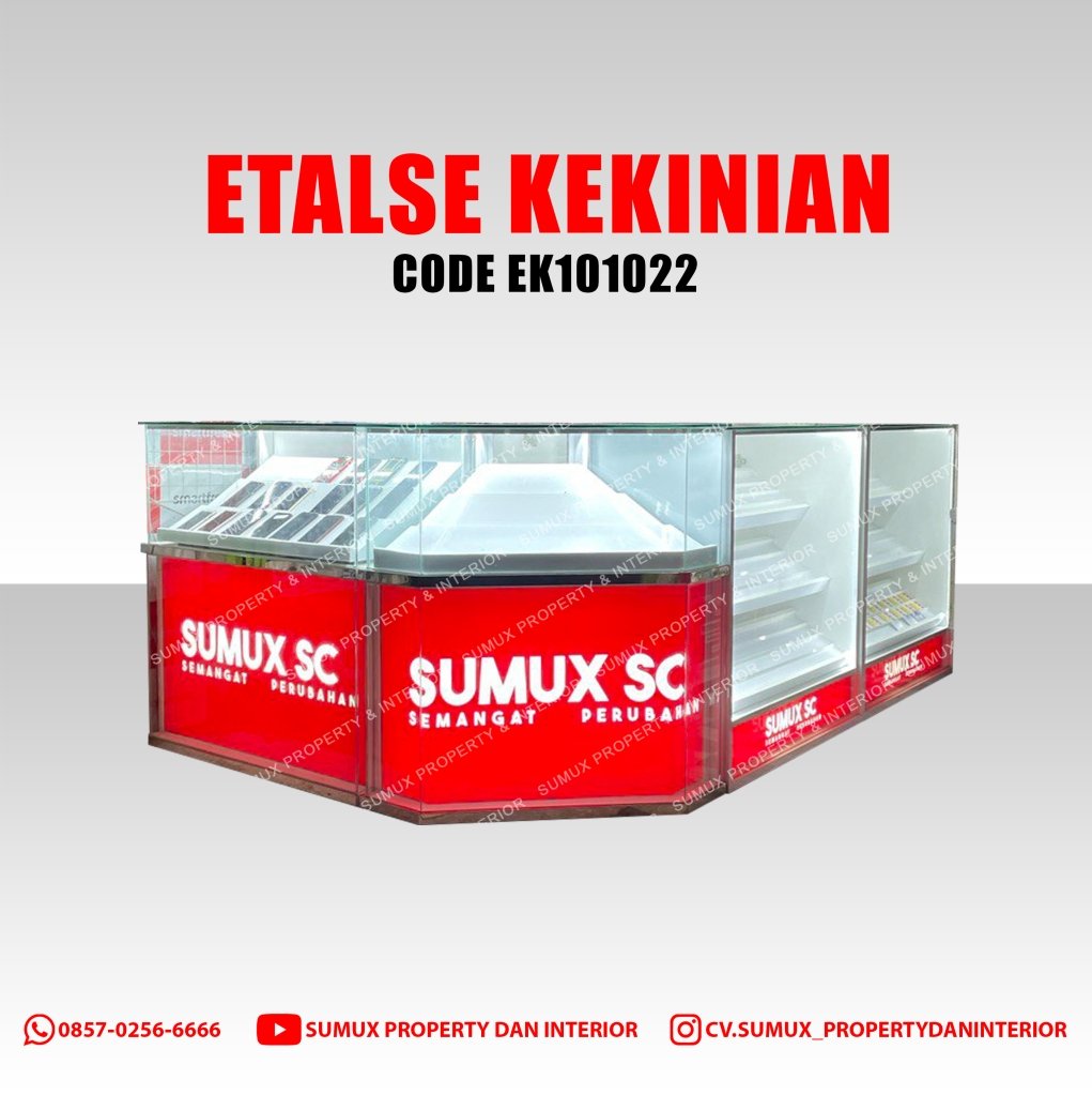 Etalase modern berbentuk L dengan desain elegan dan pencahayaan LED. Dilengkapi rak kaca bertingkat untuk menampilkan produk secara maksimal. Cocok untuk konter handphone, aksesoris, atau produk elektronik. Branding “SUMUX SC” memperkuat identitas usaha.