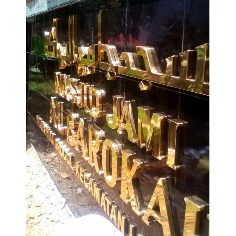 Merupakan tipe yang paling eksklusif dikarenakan harga material kuningan terhitung paling mahal dibandingkan yang lainnya. karena tampilan huruf seperti emas kuningan selalu menggunakan bahan import karna kuningan lokal akan terlihat titik2 hitam atau seperti mengelupas saat di poles dan lebih cepat hitam pemilihan plat kuningan import akan lebih tepat untuk pembuatan huruf timbul karna kadar warnanya yang lebih terang dan akan lebih menawan dan bagus untuk di pandang mata.